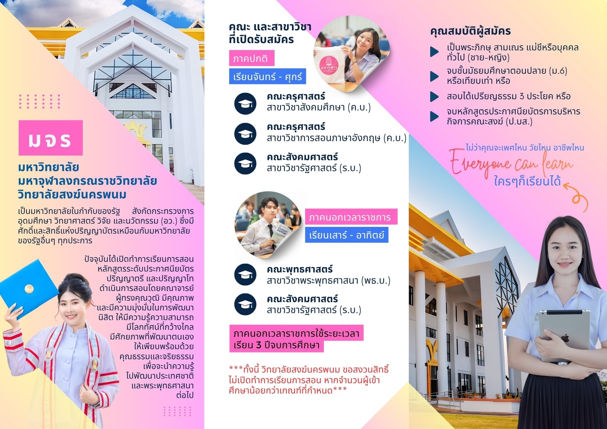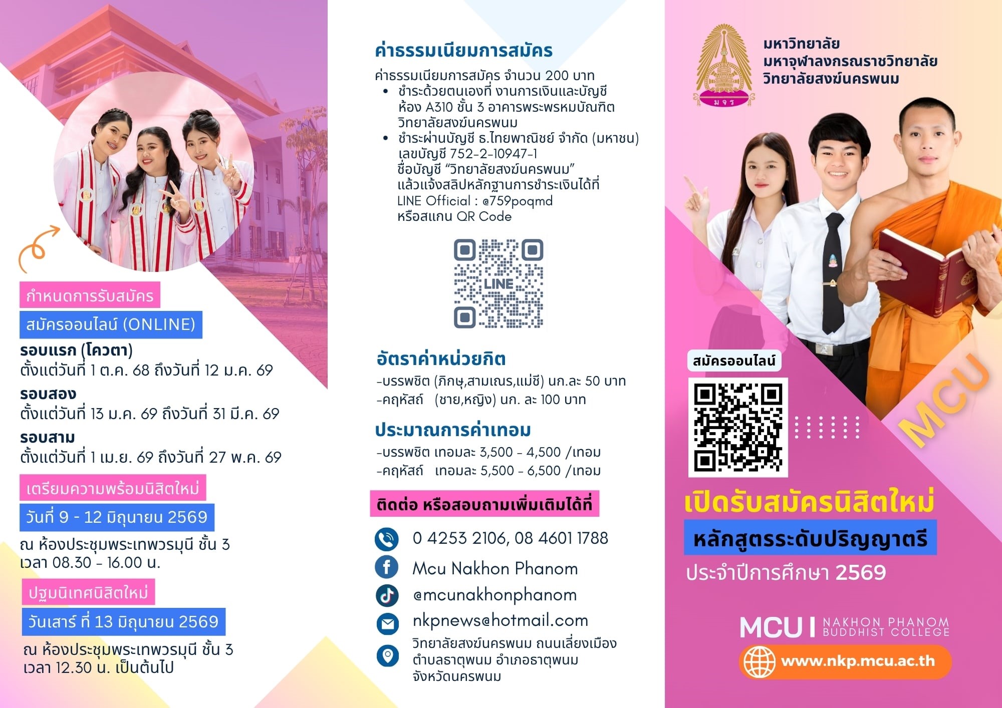 | #รอบแรก #รอบโควตา #สมัครรอบนี้มีที่เรียนทันที #เปิดรับสมัครนิสิตใหม่ หลักสูตรระดับปริญญาตรี ประจำปีการศึกษา 2569 รอบแรก มหาวิทยาลัยมหาจุฬาลงกรณราชวิทยาลัย วิทยาลัยสงฆ์นครพนม กำหนดการรับสมัครออนไลน์ (Online) รอบแรก (โควตา) ตั้งแต่บัดนี้ ถึงวันที่ 12 มกราคม 2569 คณะ/สาขาวิชาที่เปิดรับสมัคร ภาคปกติ (เรียนวันจันทร์ – ศุกร์) ✅ คณะครุศาสตร์ สาขาวิชาสังคมศึกษา (ค.บ.) ✅ คณะครุศาสตร์ สาขาวิชาการสอนภาษาอังกฤษ (ค.บ.) ✅ คณะสังคมศาสตร์ สาขาวิชารัฐศาสตร์ (ร.บ.) ภาคนอกเวลาราชการ (เรียนวันเสาร์ – อาทิตย์) ✅ คณะพุทธศาสตร์ สาขาวิชาพระพุทธศาสนา (พธ.บ.) ✅ คณะสังคมศาสตร์ สาขาวิชารัฐศาสตร์ (ร.บ.) สมัครออนไลน์ (Online) ผ่าน QR Code หรือคลิ๊ก>>> คลิก เว็ปไซต์วิทยาลัย http://www.nkp.mcu.ac.th/ ☎️โทรศัพท์ สำนักงาน : 042-532106 หรือ ???? 084-6011788 ❤️️️เรียนใกล้บ้าน❤️ค่าเทอมถูก❤️หลักสูตรได้มาตรฐาน❤️️️ |